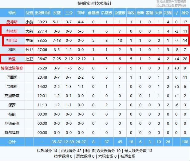 快船(客队):哈登28分6板5助2帽、桑德斯17分1板1助、祖巴茨14分13板1助、科林斯11分7板、巴图姆11分6板1助、博格达诺维奇9分7板5助、邓恩7分2板5助、洛佩斯6分1板、保罗3分2板、克里斯蒂2分